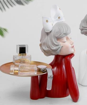 A stylish polyresin sculpture featuring a bow girl design, doubling as a decorative tray. Perfect for desktop organization or home décor, it adds a modern and artistic touch to any space.